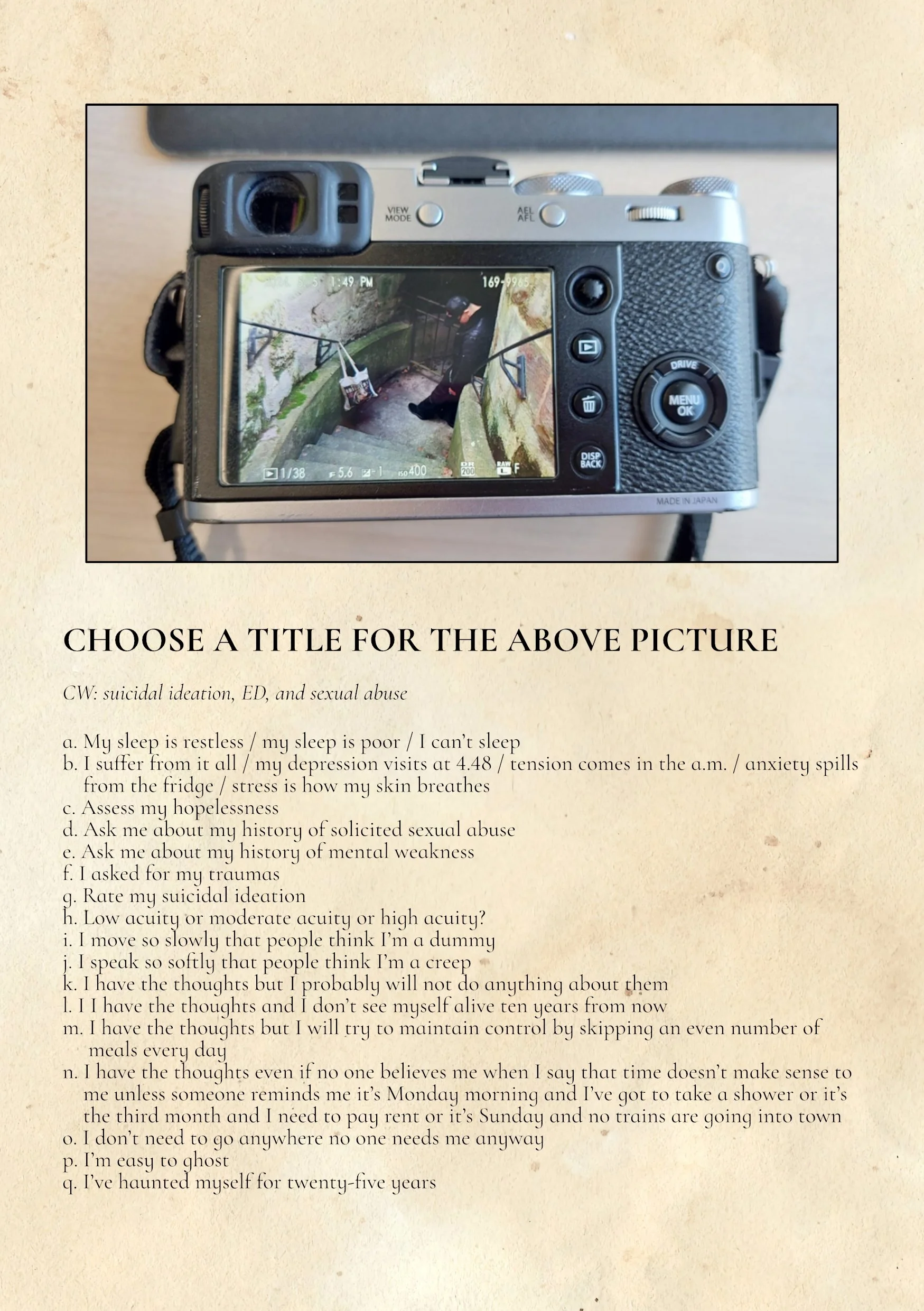 [At the top of the page, above the poem and title, is a photograph of a camera showing a black-clothed individual resting against the railing of an external staircase.]